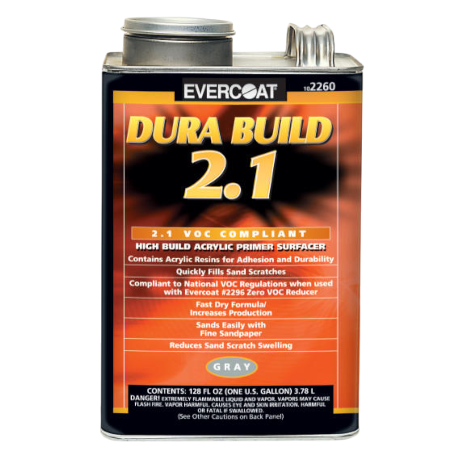 DURA BUILD 2.1 reduces 1:1 with Evercoat #2296 Universal Zero VOC Reducer, sprays smoothly through standard primer guns, and is ready to sand in as little as 30 minutes, allowing faster turnaround times without sacrificing finish quality. Once sanded, it provides an excellent foundation for modern basecoat/clearcoat and single-stage paint systems.