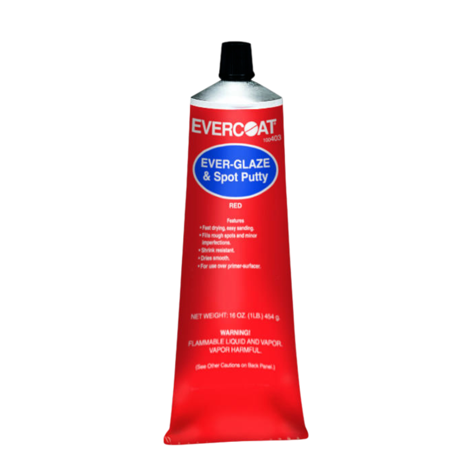 Evercoat® Ever-Glaze® & Spot Putty is a fast-drying, red oxide lacquer spot putty designed to fill minor surface imperfections such as sand scratches, pinholes, file marks, and small low areas not completely addressed by primer surfacers. Formulated as a single-component nitrocellulose putty, it spreads smoothly, dries quickly, and sands easily with minimal shrinkage—delivering a clean, refined repair surface ready for priming and topcoat.
